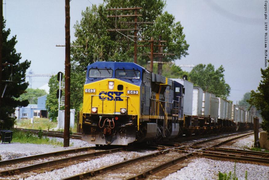 Fostoria, in northern Ohio, is a hotbed of CSX activity, and has a strong NS presence. The CSX and NS tracks cross at the old B&O depot, and traffic is controlled by CSX's "F Tower". The well-preserved former B&O depot now serves as the Amtrak station. Both public parking and safe train watching can be found here. To get to the depot, drive to the town center, then follow the signs to the Amtrak station. Fostoria has a rich railroading history. As one approaches the center of town from the south a well preserved NKP railroad overpass with NKP lettering cast in concrete can be seen. As one leaves town to the south on US23, a B&O overpass can be seen with B&O painted markings. CSX currently uses the B&O overpass and NS uses the NKP overpass. At least one bridge with C&O lettering remains in town, but I neglected to record the location. Railfan Tony Torres informs me that as recently as 1999, the brick interlocking tower remained along what's now the CSX. On the day of my visit, I ran out of time and was unable to see this. I am told that outside of town there's a large autorack center. I've not yet been able to visit this facility. My thanks go to railfan Gordon Schmidt for much of this information. See the Trains magazine Hotspot: Fostoria, Ohio article.