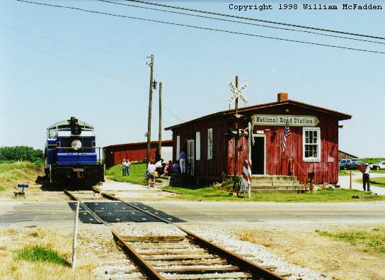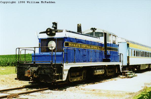 I have no association with the Buckeye Central Scenic Railroad, just an interest in tourist shortline railroads. I have built and I maintain this page as a service to other railfans. UPDATE (March 13, 2008): The Buckeye Central Scenic Railroad is now part of the Zanesville and Western Scenic Railroad. For more information about the ZWSR, visit the official site at http://www.zwsr.org/. (The information in the following paragraphs might not accuraretly represent the ZSWR.) My wife, children, and I visited the Buckeye Central Scenic Railroad in early August, 1998. The weather was ideal for this visit, with a bright, clear blue sky, and temperatures in the low 80s. The BCSR is a typical volunteer-run tourist shortline railroad. According to assistant conductor Joe Lavender, the line was originally built in 1871 by the Newark, Somerset, and Straitsville Railway. The depot, which is still used by the BCSR, was built as a freight station in 1872 by the Newark, Somerset, and Straitsville Railway, as was the still-existing cattle-loading barn. The Baltimore & Ohio Railroad took over the railroad, and the line became part of the Shawnee Branch of the B&O. The line was retired by the B&O in 1971. The BCSR has a nicely-maintained EMD SW-1 painted win B&O colors with BCSR lettering. According to engineer Jack Shafer, the ex-PRR SW-1 was built in 1948 and has a 600hp 563 cubic inch prime mover. The comfortable non-airconditioned coaches are painted in Cuyahoga Valley colors. The train we rode on consisted of two cars coaches, but I saw that the railroad also has an open gondola with benches. As is typical of tourist shortline railroads, track speed was about ten miles per hour. The road has a ruling grade of 2%. The locomotive pushed the coaches to the halfway-point, then pulled the train back to the depot. There was no narration during the ride, although conductor Harold Noll and assistant conductor Joe Lavender gladly answered questions and volunteered information about the line. After the ride, which lasted about an hour, my children were invited into the locomotive by engineer Jack Shafer and assistant engineer Warner Searls, where my daughter was able to sit in the engineer seat and blew the horn. According to the brochure, the train runs weekends 1pm and 3pm Memorial Day through October 15. In addition, the railroad features a Haunted Halloween Train Ride 7pm the last week of October, Christmas Santa Specials the first two weeks in December, and a Train Robbery train.