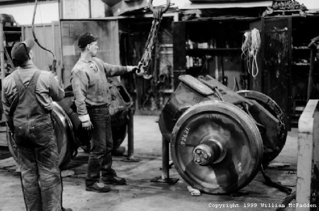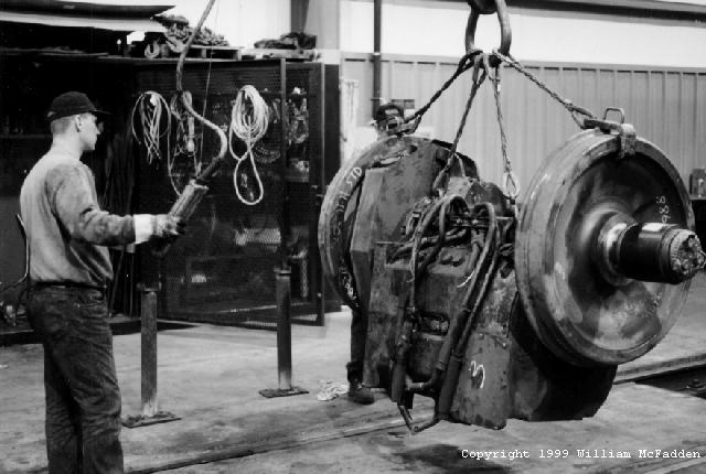 - An Ohio Central workman positions a locomotive power truck on February 27, 1999.