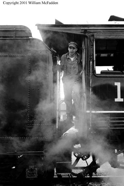 - Jason Johnson of the OC Steam Department stands in doorway of locomotive #1551 in Sugarcreek, Ohio.