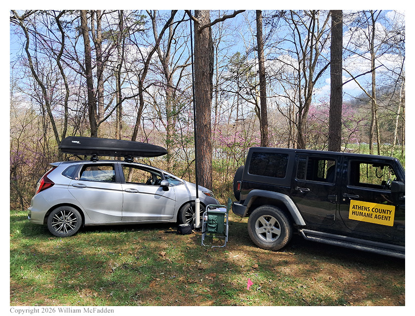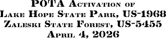 On Saturday, April 4, 2026, one member of the Southeast Ohio Radio Adventure Team performed successful simultaneous activations of Lake Hope State Park (US-1968) and Zaleski State Forest (US-5455) in Ohio as part of the Parks on the Air (POTA; link).