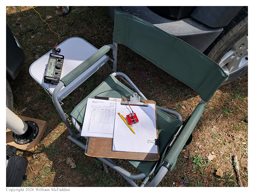 After verifying that Eric's activity wouldn't interfere with Andy's ability to support the half-marathon, Eric set up his station, deploying his Tufteln (info) EFRW as a 29' vertical supported on a 31' telescoping fiberglass mast in a drive-on base, and placing two 17' counterpoise wires directly on the ground. Placing his folding camp-chair at the base of the mast, and placing his Elecraft KX2 on the camp-chair's flip-up table, Eric was on the air at 1651 UTC.