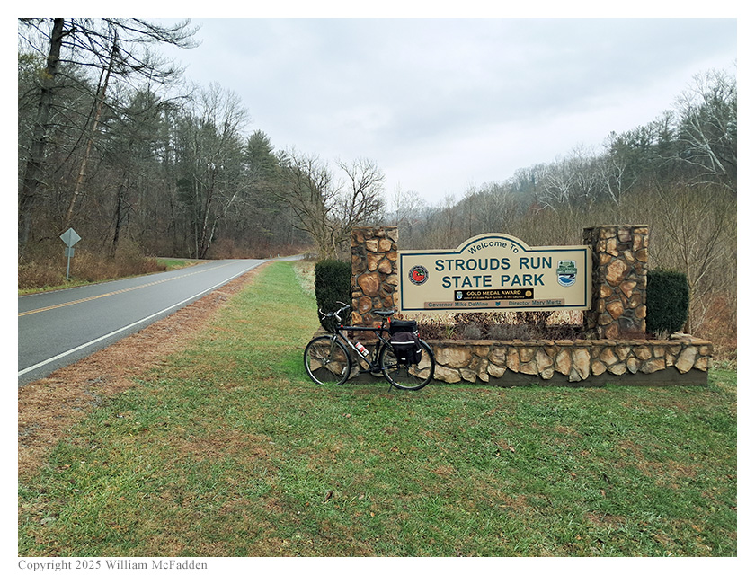 On Tuesday, December 23, 2025, one member of the Southeast Ohio Radio Adventure Team performed a successful bicycle-portable activation of Strouds Run State Park (US-1994) as part of the Parks on the Air (POTA; link) program.