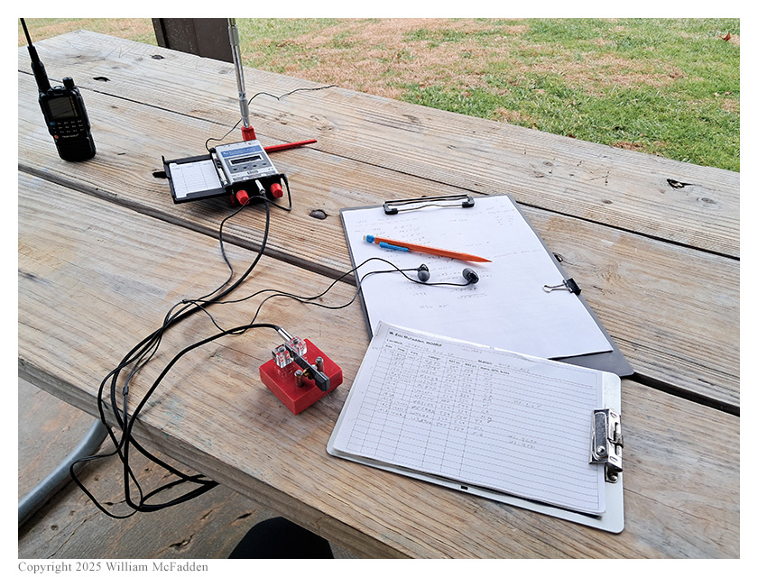 Eric started his operation on 20m by finding himself a clear frequency to run, self-spotting himself on POTA Spots, and beginning to call "CQ POTA". His first QSO came at 1849 UTC with K0FD in Missouri. This was followed at 1855 UTC by a QSO with VE3TEF in Ontario, at 1859 UTC by a QSO with N1XV in New Jersey, and at 1901 UTC with K2MYQ in New Jersey.