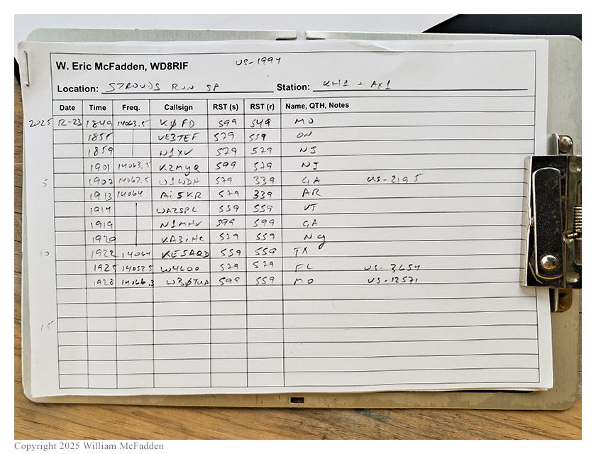 Eric also submitted his log to the World Wide Flora and Fauna in Amateur Radio (WWFF; link) program for an operation at Strouds Run State Park, KFF-1994.