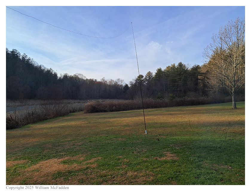 Eric arrived at Bulldog Shelter at 2008 UTC, finding the shelter to be unoccupied. Eric chose a conveniently-located picnic table and deployed his Tufteln (link) 35' EFRW as a sloper supported on a Goture Red Fox Super Hard 720 carbon-fiber mast on a spike, placing three 17' counterpoise wires directly on the ground. Placing his Elecraft KX2 on the picnic table and hooking up the Whiterook MK-33 single-lever paddle and earbuds, Eric was on the air at about 2017 UTC.
