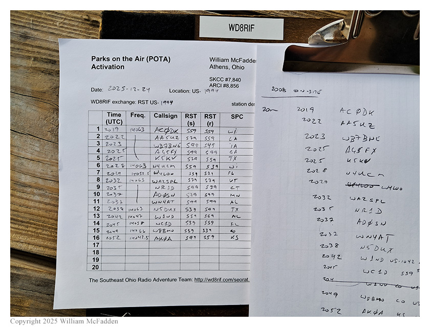 On Wednesday, December 24, 2025, one member of the Southeast Ohio Radio Adventure Team performed an activation of Strouds Run State Park (US-1994) as part of the Parks on the Air (POTA; link) program.