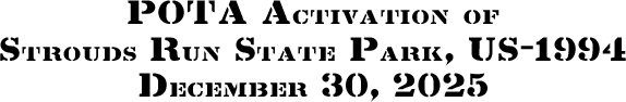 On Tuesday, December 30, 2025, one member of the Southeast Ohio Radio Adventure Team performed an activation of Strouds Run State Park (US-1994) as part of the Parks on the Air (POTA; link) program.
