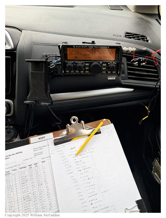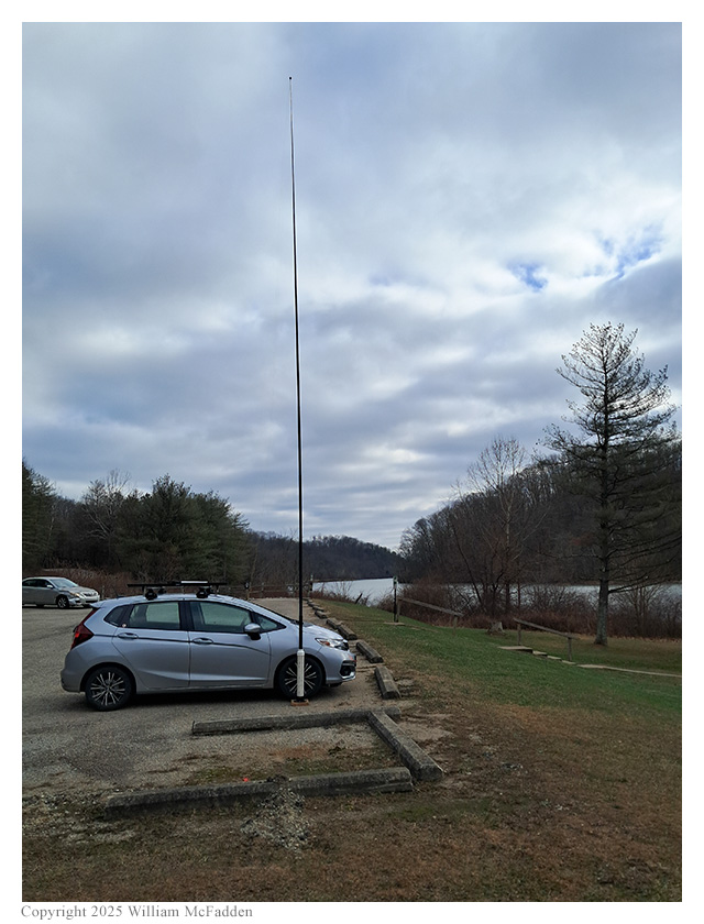 Eric arrived at Bulldog Shelter at about 1640 UTC, finding the shelter and the parking lot to be unoccupied. Because of the bitter cold and the wind, he chose to operate inside his car.He quickly deployed his 29' Tufteln (link) EFRW as a vertical on a Jackite 31' telescoping fiberglass mast supported in a drive-on base, placing three 17' counterpoise wires directly on the ground. Mounting his Elecraft KX2 on his car's passenger-side dashboard, and connecting earbuds and a Whiterook MK-33 single-lever paddle, Eric was on the air at 1650 UTC.