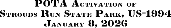 On Thursday, January 8, 2026, one member of the Southeast Ohio Radio Adventure Team performed a successful bicycle-portable activation of Strouds Run State Park (US-1994) as part of the Parks on the Air (POTA; link) program.