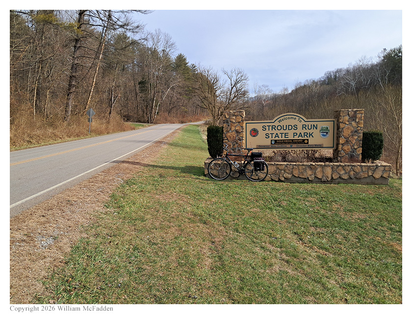 Taking advantage of an unseasonably warm (~60°) January afternoon to do both a bicycle ride and a POTA activation, Eric McFadden, WD8RIF, bicycled from his work-office's parking lot to Bulldog Shelter within Strouds Run State Park.
