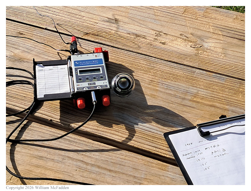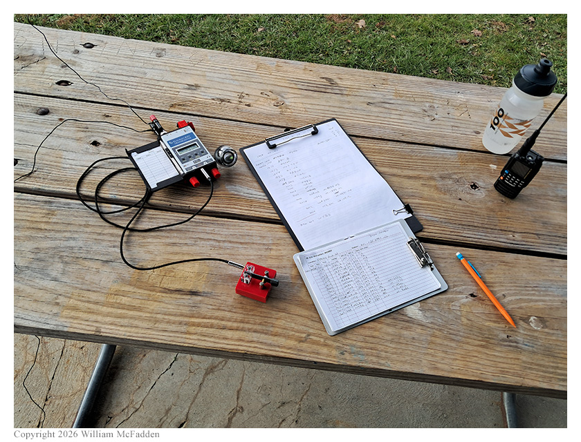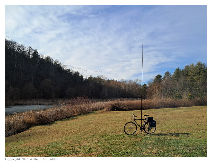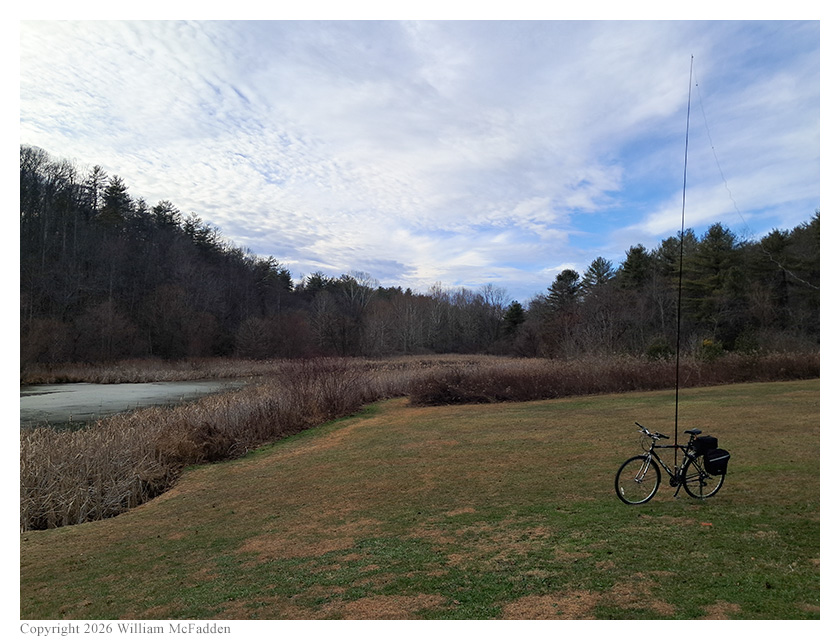 This was Eric's first bicycle-portable POTA activation since the December 28, 2025 activation during which his bicycle's kickstand had failed, dumping his mast and yanking his KH1 onto the wet grass. He was happy that the repaired kickstand supported his mast and antenna well for this activation.