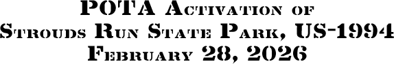On Saturday, February 28, 2026, one member of the Southeast Ohio Radio Adventure Team performed a successful bicycle-portable activation of Strouds Run State Park (US-1994) as part of the Parks on the Air (POTA; link) program.