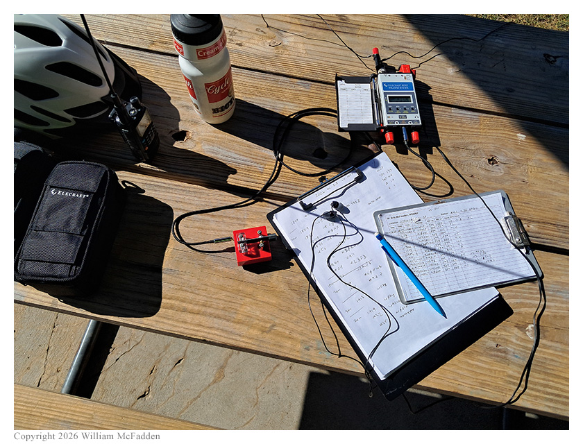 With a reported temperature of 62°, Eric started his ride at 1810 UTC, and arrived at Bulldog Shelter about half an hour later. An older couple with a pair of young French Bulldogs had just arrived, but they didn't mind sharing the picnic shelter. Eric quickly deployed his ad hoc 35' EFRW antenna supported as a sloper on his Goture Red Fox Super Hard 720 carbon-fiber mast strapped vertically to his bicycle, with a single 13' counterpoise wire placed directly on ground. Placing his Elecraft KH1 on a picnic table, Eric was on the air at 1849 UTC.
