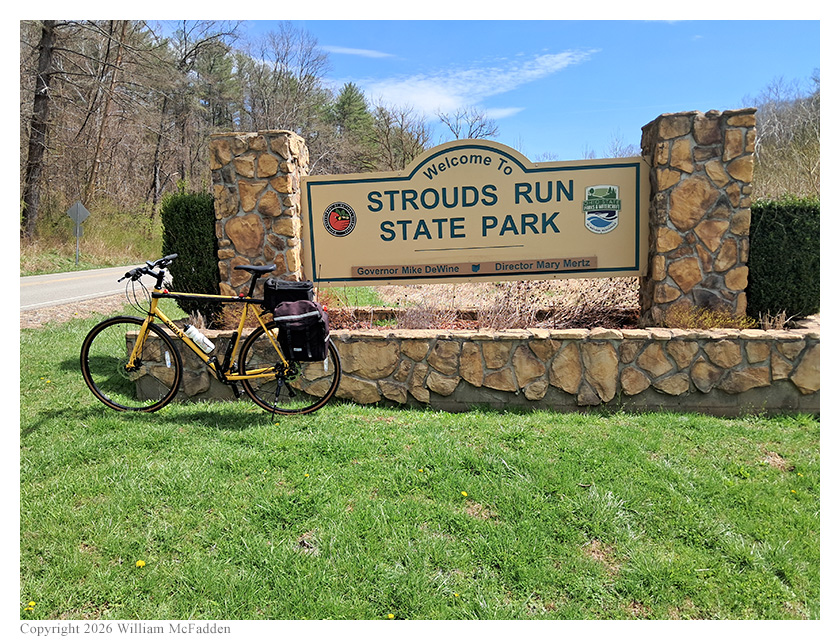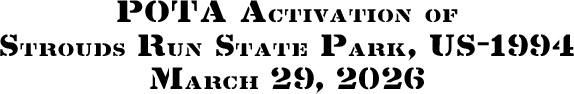 On Monday, March 29, 2026, one member of the Southeast Ohio Radio Adventure Team performed a successful bicycle-portable activation of Strouds Run State Park (US-1994) as part of the Parks on the Air (POTA; link) program.