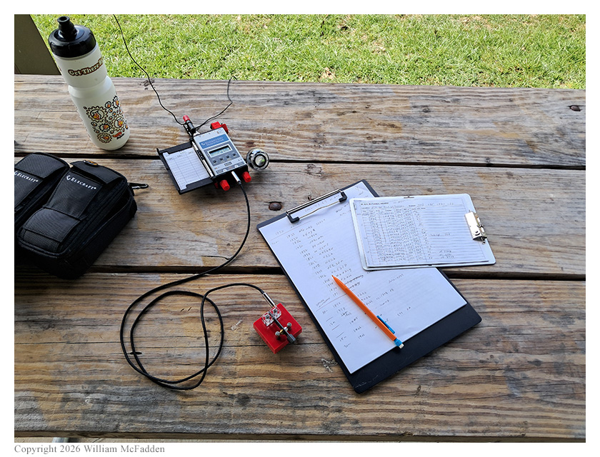 Eric started his ride at 1744 UTC, and arrived at Bulldog Shelter at 1817 UTC, finding a group of three picnicking in the shelter. After being given permission to "crash their party", Eric selected a picnic table and began setting up his station. Because it was quite windy, and because Eric hadn't yet determined if his new bicycle can serve as a stable tripod for his mast, Eric deployed his ad hoc 35' EFRW antenna as a sloper to the top of his Goture Red Fox Super Hard 720 carbon-fiber mast held upright on a spike stuck into the ground. (And, he quite stupidly forgot to lay down or connect his 13' counterpoise wire until after he had made his first thirteen QSOs!) Placing his Elecraft KH1 on a picnic table, and connecting his Whiterook MK-33 paddle and a small powered speaker, Eric was on the air at 1830 UTC.