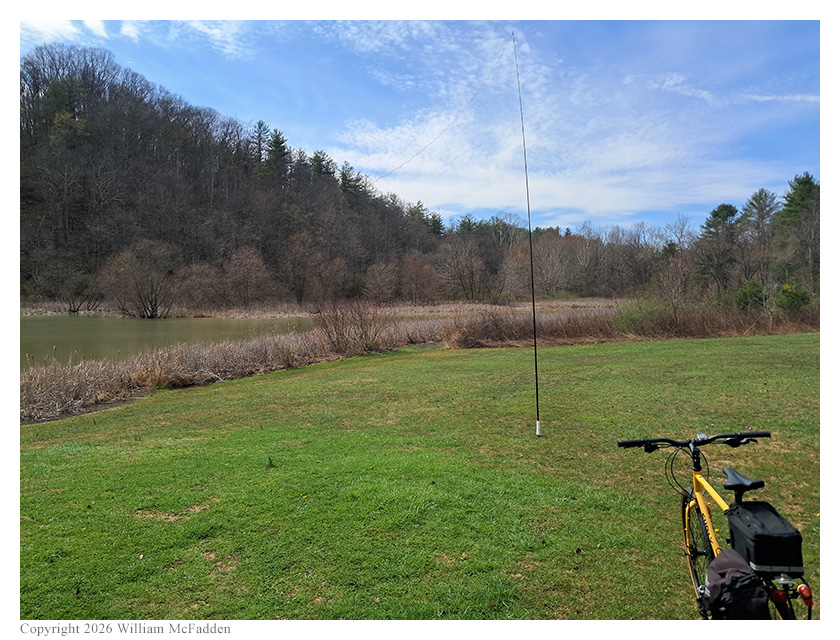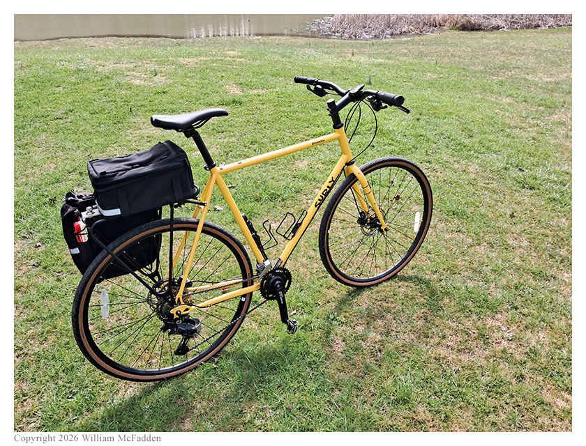 Eric was quite pleased with the performance of his new Surly Preamble Flat Milky Lemonade (info). This bicycle replaced the ancient black GT Arette that had suffered a broken frame on the previous bicycle-portable POTA activation of Strouds Run State Park (on March 9, 2026), the bicycle that had been his primary bicycle since 1998 and a bicycle on which he had ridden more than 30,000 miles. Eric ordered the new Surly with a 2x9 drivetrain instead of the 1x9 drivetrain that the Preamble comes with from the factory, specifying chainrings and cogs to provide better gearing for climbs. The Surly is equipped with hydraulic disc brakes, something Eric had no previous experience with, and he quickly decided that he quite likes hydraulic disk brakes. The new Surly felt extremely good on this ride—much better, in fact, than Eric had anticipated; it seems the bicycle industry has learned a thing or two about bicycle design and performance since 1998!