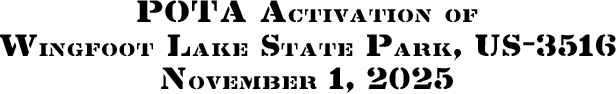 On Saturday, November 1, 2025, two members of the Southeast Ohio Radio Adventure Team performed an activation of Wingfoot Lake State Park (US-3516) as part of the Parks on the Air (POTA; link) program.