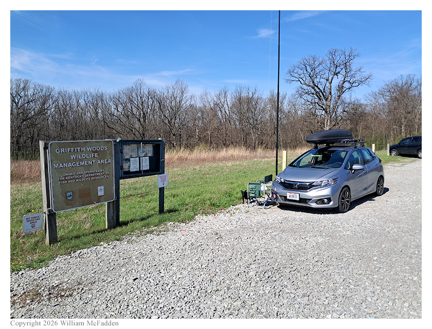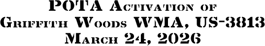 On Tuesday, March 24, 2026, one member of the Southeast Ohio Radio Adventure Team performed a successful activation of Griffith Woods Wildlife Management Area (US-3813) in Kentucky as part of the Parks on the Air (POTA; link) program.