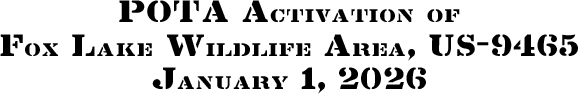 On Thursday, January 1, 2026, one member of the Southeast Ohio Radio Adventure Team performed a successful activation of Fox Lake Wildlife Area in Ohio as part of the Parks on the Air (POTA; link) program.