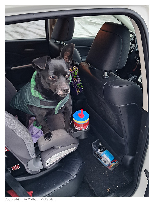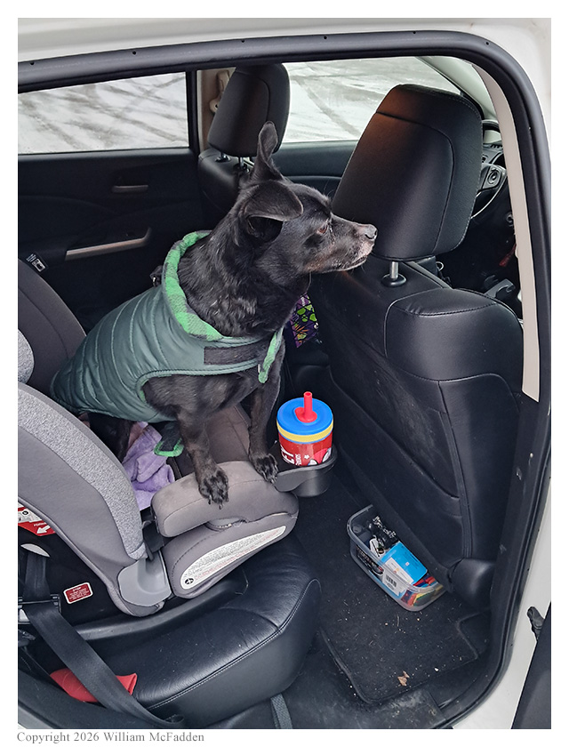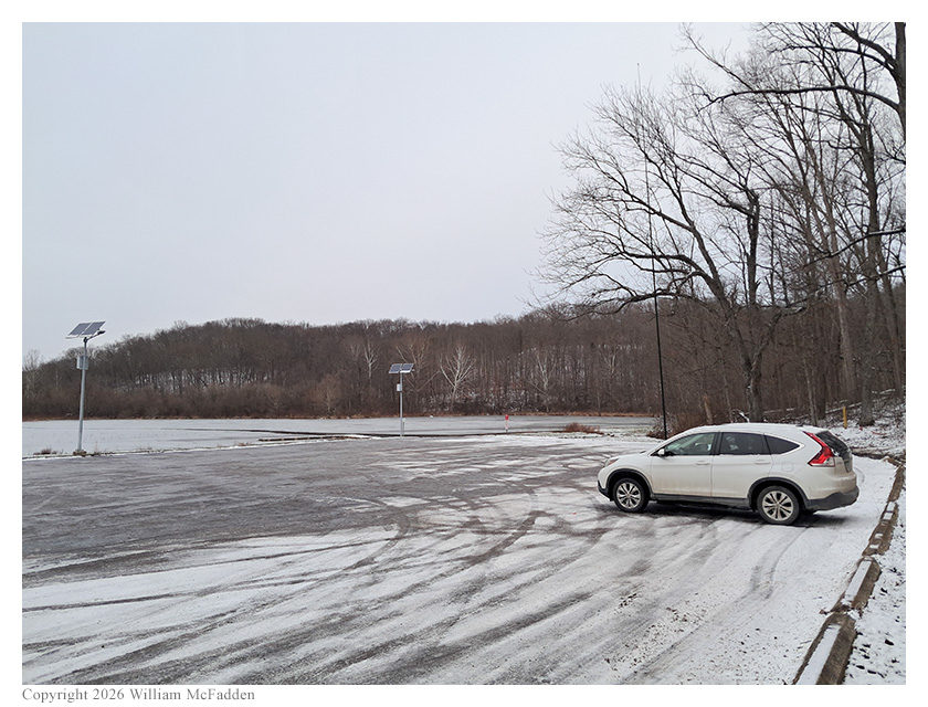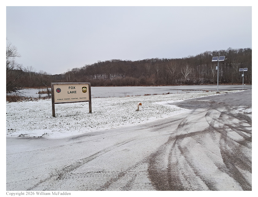 In order to perform a "New Year's Week" activation, Eric McFadden, WD8RIF, visited Fox Lake Wildlife Area on a very cold New Year's Day, Spring afternoon, arriving at the empty boat ramp parking area at about 2010 UTC. Eric was accompanied by little dog Theo. Eric began the drive to Fox Lake right immediately after Athens County went from a Level 2 Snow Emergency to a Level 1 Snow Emergency. Because his car is not equipped with snow tires this year, Eric drove his wife's Blizzak-equipped AWD Honda CRV.