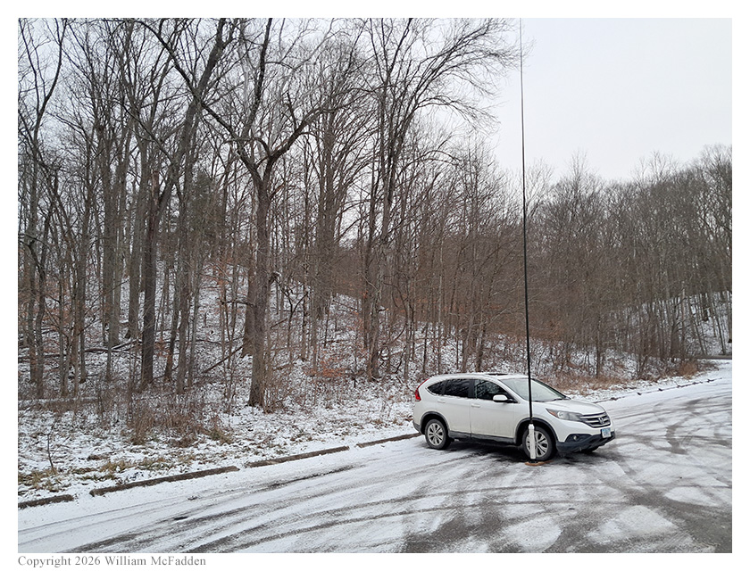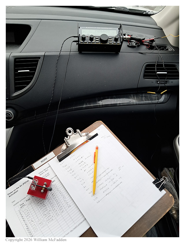 After choosing an out-of-the-way parking area without overhanging trees, Eric deployed his Tufteln (link) EFRW as a 29' vertical supported on a Jackite 31' telescoping fiberglass mast supported in a drive-on base, placing two 17' counterpoise wires directly on the ground. Placing his Elecraft KX2 on the car's passenger-side dashboard and hooking up his earbuds and Whiterook MK-33 single-lever paddle, Eric was on the air at 2021 UTC.