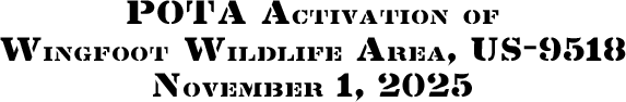 On Saturday, November 1, 2025, two members of the Southeast Ohio Radio Adventure Team performed an activation of Wingfoot Wildlife Area (US-9518) as part of the Parks on the Air (POTA; link) program.