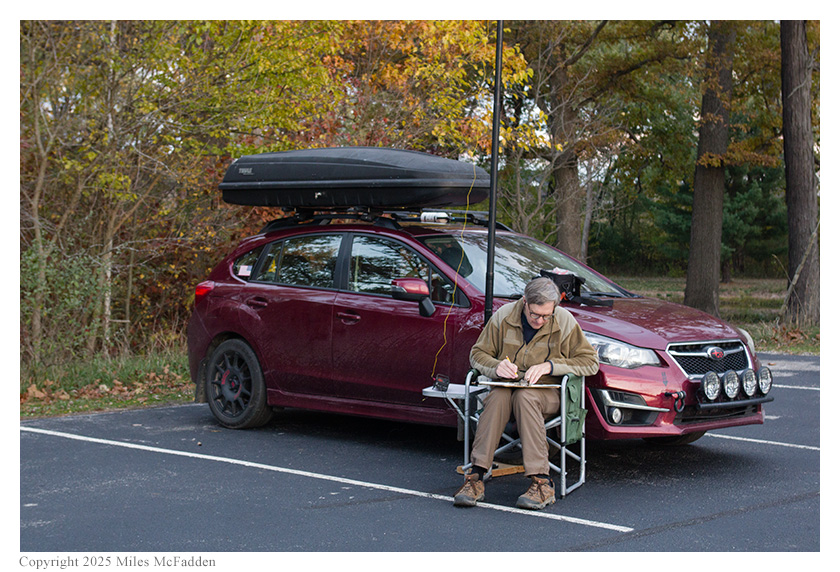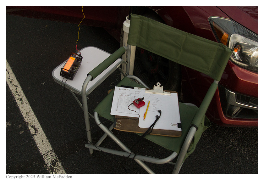 Although darkness was rapidly falling, the temperature was still nice, so Eric chose to operate outside the car. He quickly deployed his Tufteln (link) EFRW antenna as a 29' vertical supported on a 31' Jackite telescoping fiberglass mast in a drive-on base, placing two 17' counterpoise wires directly on the asphalt. Placing his Elecraft KX2 on his folding camp-chair's flip-up table, Eric was on the air at 2215 UTC.