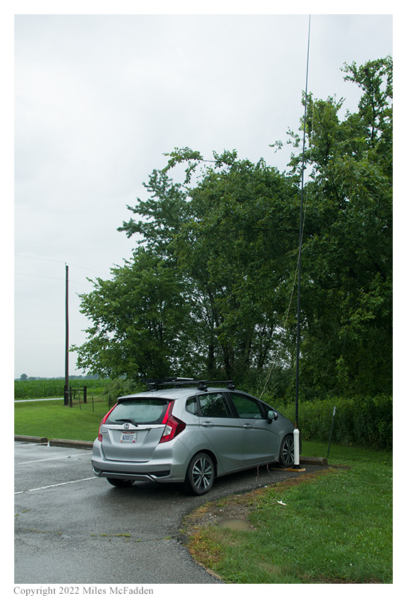 Eric, Miles, and Theo arrived at Stage's Pond State Nature Preserve at about 1630 UTC, about half an hour later than planned due stop-and-go traffic on US-33 between Logan and Lancaster, finding the nature preserve's two parking areas to be empty. With the car parked on the edge of one of the parking lots, Eric and Miles deployed the 28½' wire vertical on a 31' Jackite telescoping fiberglass mast supported on a drive-on base. Because of the rain, Eric set up his Elecraft KX3 inside the car and was on the air at 1642 UTC.