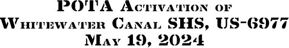 On Sunday, May 19, 2024, three members of the Southeast Ohio Radio Adventure Team performed successful activations of Whitewater Canal State Historic Site in Indiana as part of the Parks on the Air (POTA; link) program.