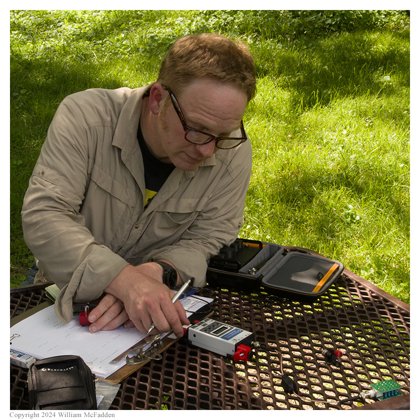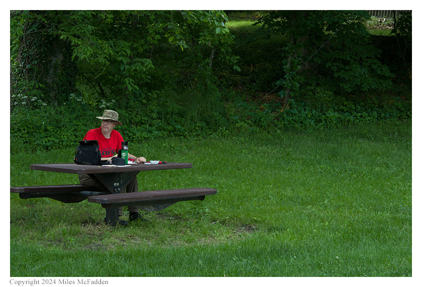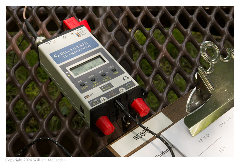 Eric chose a picnic table under a large shade tree and deployed his Elecraft KH1 transceiver and an ad hoc end-fed random wire antenna.