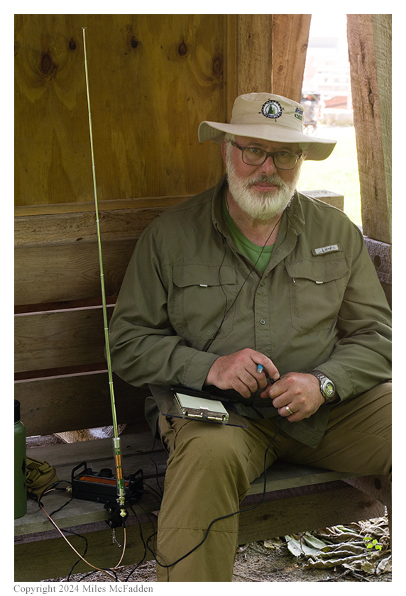 Brian chose the shaded bench behind an informational kiosk and deployed his Elecraft KX2 transceiver and AX1 antenna system.