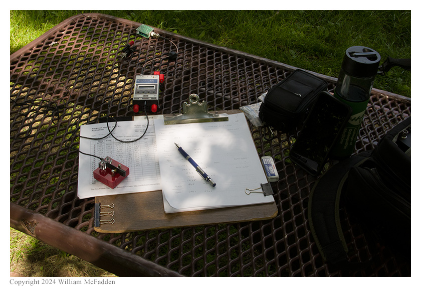This was to be Eric's second activation using his KH1 transceiver, his first being the activation a few hours earlier at Pater Wildlife Area in Ohio. For this operation, Eric chose to test an ad hoc end-fed random wire antenna consisting of the 33' wire from the Elecraft AXE1 40m Antenna Extender folded back to a length of 29' and supported as a sloper up to a Goture Red Fox Super Hard 720 carbon-fiber mast, fed through a binding-post adapter and operating against the KH1's 13' wire lying on the ground as a counterpoise. Eric had hoped that this wire would tune easily on all the bands the KH1 covers and this did prove to be the case. As at Pater Wildlife Area, Eric operated his KH1 in "tabletop" mode and used his Whiterook MK-33 paddle (link) instead of the KHPD1 paddle.