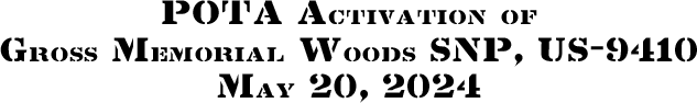 On Monday, May 20, 2024, three members of the Southeast Ohio Radio Adventure Team performed successful activations of Gross Memorial Woods State Nature Preserve (US-9410) in Ohio as part of the Parks on the Air (POTA; link) program.