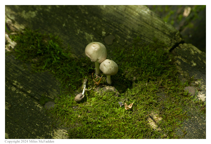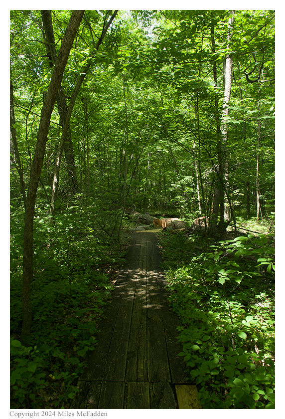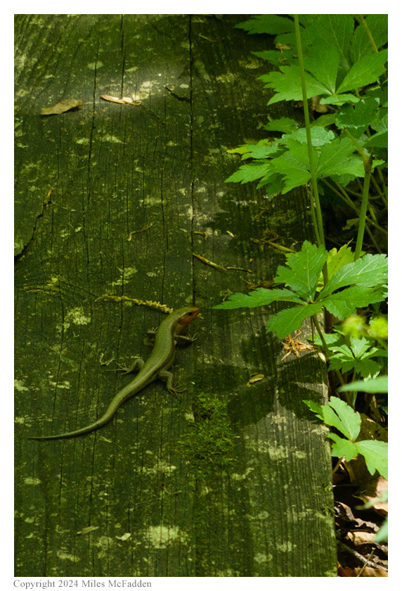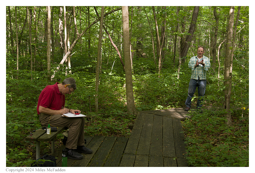 The hike along the boardwalk was easy and lovely, the only problem being the very large population of mosquitoes. Thomas had wisely applied insect repellent to his whole body before begininning the hike but Eric, initially concerned only about ticks, had only sprayed his pant legs and was, therefore, quite vulnerable to mosquitoes on his arms, neck, and face. (Indeed, after he found the bench on which was going to operate, Eric asked Miles to return to the car to fetch the insect repellent so he better armor himself against the mozzies.) Along the boardwalk, numerous skinks were seen before they slipped under the boardwalk, and numerous kinds of birds were heard even if they couldn't be easily seen.
