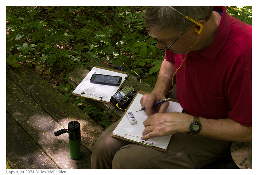 Having had little success running a frequency, Eric decided to hunt for P2P QSOs and he had some success on 20m. At 1939 UTC, Eric completed a P2P QSO on 20m with VA2IDX who was activating Mont-Saint-Bruno National Park (CA-0508) in Quebec. At 1957 UTC, Eric completed a P2P QSO on 20m with N0ANE who was performing a two-fer activation of Minnesota Valley State Recreation Area (US-7145) and Minnesota Valley State Trail (US-9384) in Minnesota. At 2000 UTC, Eric completed a P2P QSO on 20m with VE6LK who was activating Lloyd Creek Natural Area (CA-3067) in Alberta. It was during this period of hunting that Eric saw a raccoon pass by about 75' away, and Thomas reported smelling signs of a skunk nearby on other portions of the trail.