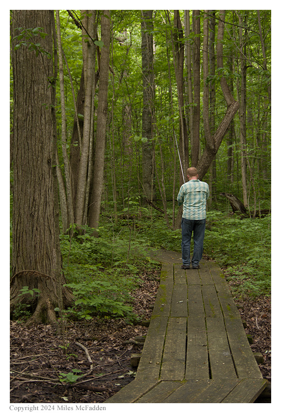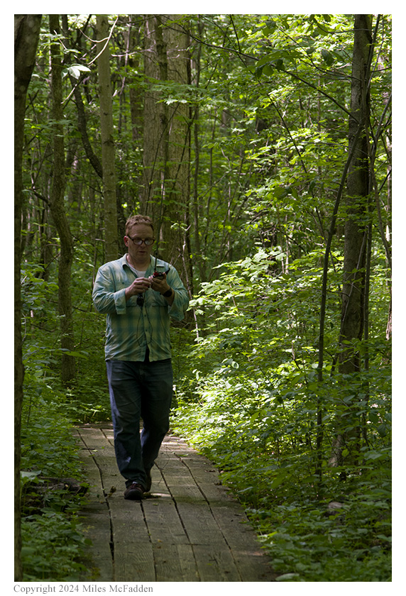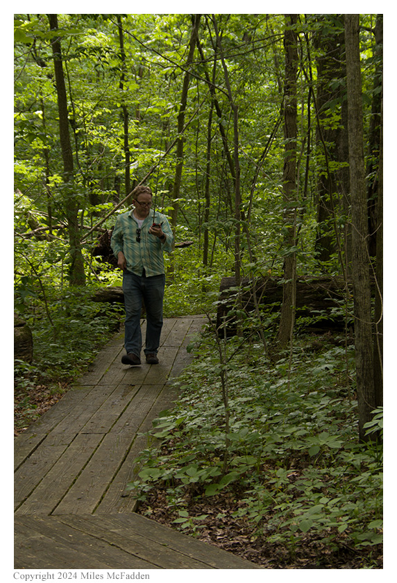 Upon arrival at Gross Memorial Woods and seeing the boardwalk hiking trail which makes a 0.6-mile loop through the small swamp forest nature preserve, Thomas declared he would operate pedestrian mobile ("/PM") using his Elecraft KH1 transceiver in the mode for which it was designed. Knowing that there was at least one bench along the trail, Eric decided to hike until he found a suitable bench, and he would set up his Elecraft KX2 station there. Miles would not operate but would do most of the activation photography.